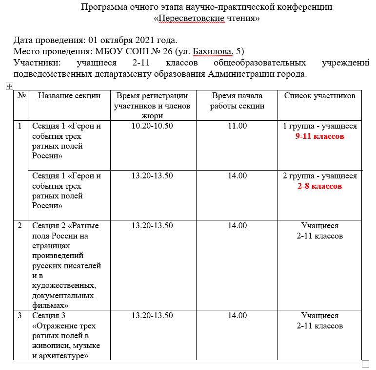Обращаем внимание, что в рамках Постановления Губернатора Ханты-Мансийского автономного округа – Югры от 14 июня 2021 года № 83 «О мерах по предотвращению завоза и распространения новой коронавирусной инфекции, вызванной COVID-19, в Ханты-Мансийском автономном округе – Югре» родители учащихся (законные представители) не будут допускаться на площадку проведения секций научно-практической конференции «Пересветовские чтения» (допускается сопровождение до места проведения и обратно без постоянного нахождения на площадке).